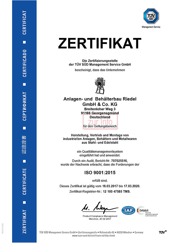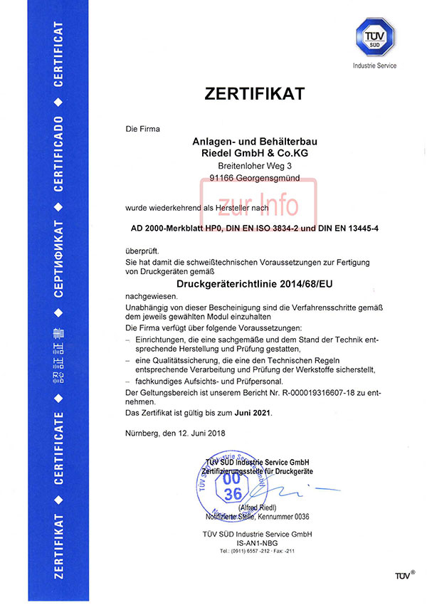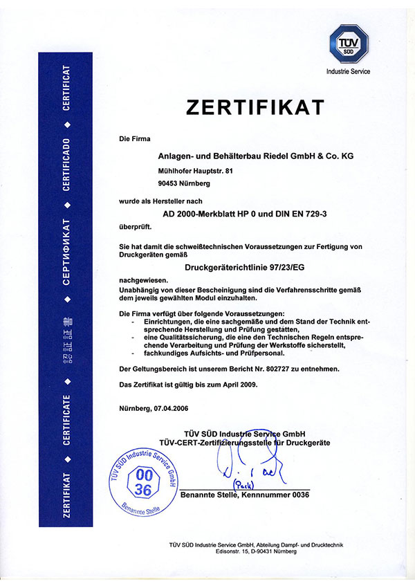 Seit dem 18. März 2014 ist unser Qualitätsmanagementsystem durch den TÜV SÜD Industrie Service GmbH nach DIN EN ISO 9001 zertifiziert. Damit garantieren wir strukturierte Abläufe, transparente Prozesse und gleichbleibend hohe Fertigungsqualität.Darüber hinaus sind wir als Hersteller für Druckgeräte aus Edelstahl gemäß der Druckgeräterichtlinie (2014/68/EU) zertifiziert – ein Nachweis für unsere technische Kompetenz und die Einhaltung höchster Sicherheitsanforderungen.