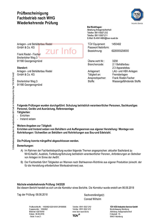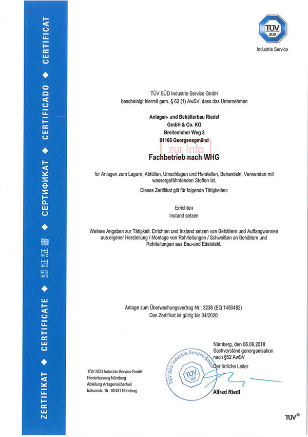 Seit dem 24. Februar 2006 sind wir außerdem als Fachbetrieb nach § 62 (1) AwSV (Wasserhaushaltsgesetz) zugelassen. Damit erfüllen wir höchste Anforderungen an Umweltschutz und Betriebssicherheit.