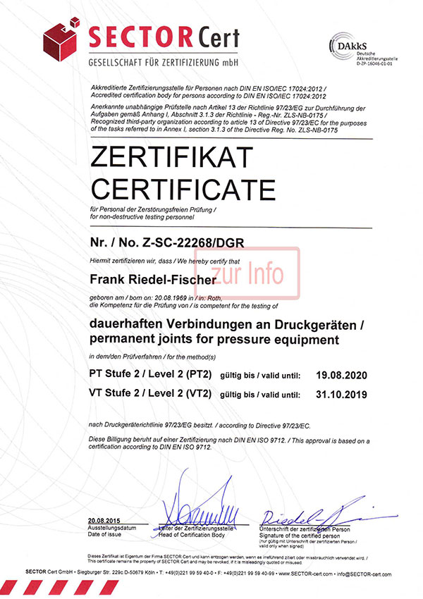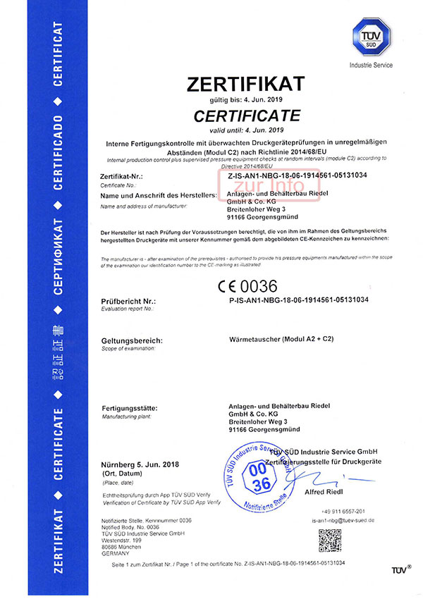 Zusätzlich verfügen wir über eine Konformitätsbewertung (Modul A2 + C2) nach der Richtlinie 2014/68/EU.